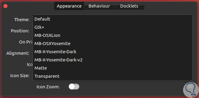 Para configurar el tema de Plank daremos clic derecho sobre él y se desplegará la siguiente ventana de configuración donde desplegamos las opciones del campo Theme: