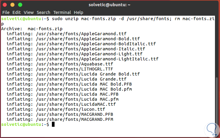 sudo unzip mac-fonts.zip -d /usr/share/fonts; rm mac-fonts.zip