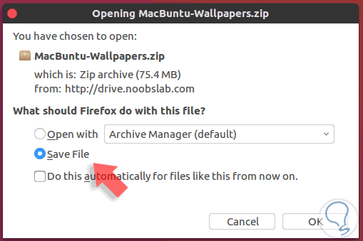 De forma automática Ubuntu despliega el siguiente mensaje donde debemos activar la casilla Save File. Una vez descargado procedemos a extraer el contenido en la carpeta Pictures – Imágenes.