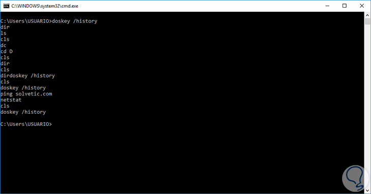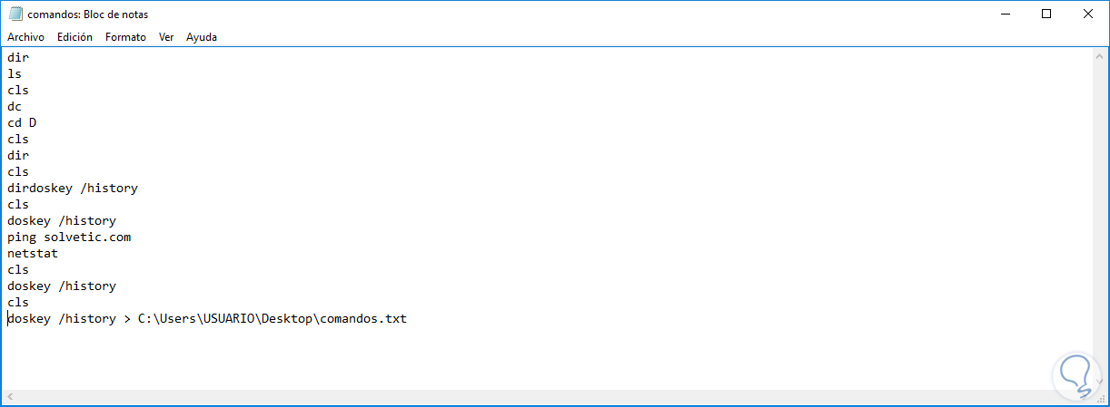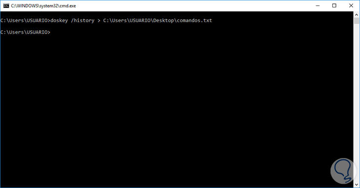 doskey /history > C:\usuarios\Usuario\Desktop\comandos.txt