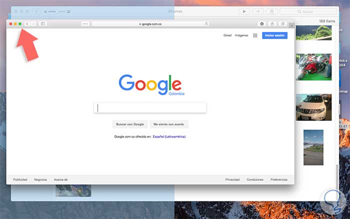 Para dividir las pantallas pulsamos de forma continua el icono de maximizar (tercer icono en la parte superior de la ventana) en alguna de las ventanas, en este caso lo hacemos en la de Safari y veremos lo siguiente: