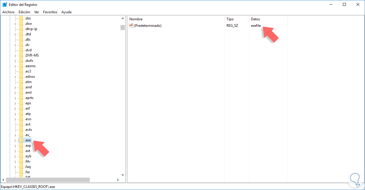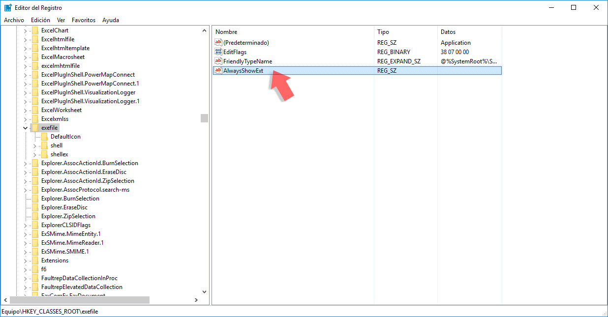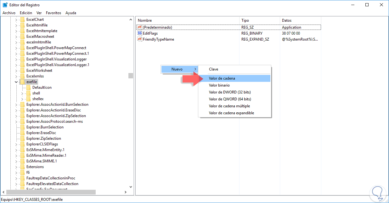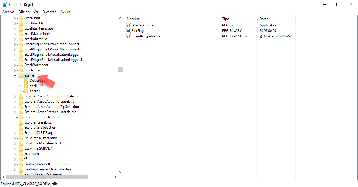 Vemos que el valor de los datos del registro predeterminado es exefile. Este valor es llamado ProgID e indica la ruta especifica en el registro la cual es