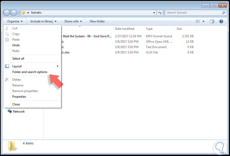 Para mostrar las extensiones vamos a la ficha Organize y seleccionamos la opción Folder and search options