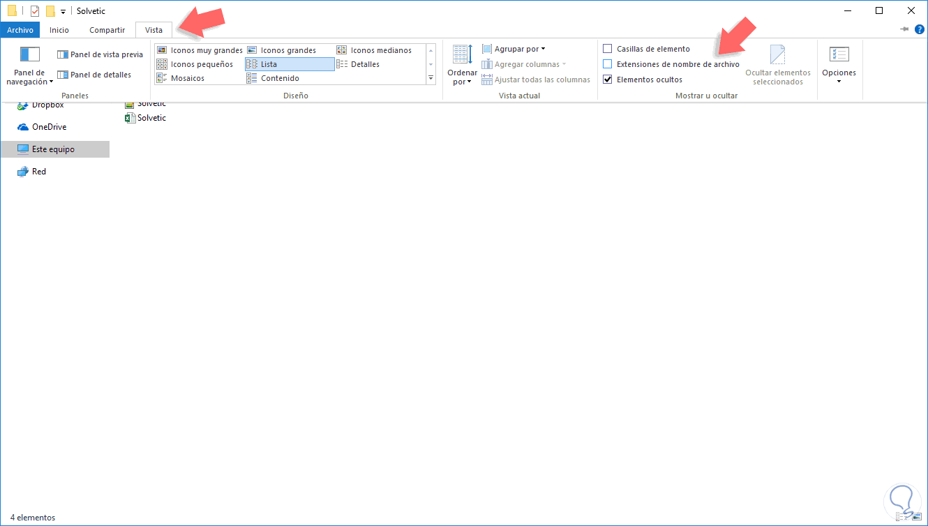 Allí activamos la casilla Extensiones de nombre de archivo ubicada en el grupo Mostrar u Ocultar El resultado será el siguiente: