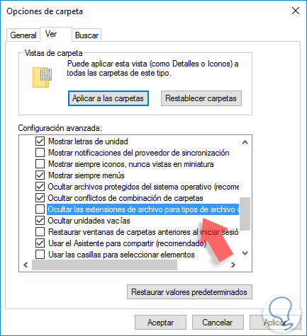 En la ventana desplegada vamos a la ficha Ver y desactivamos la casilla Ocultar las extensiones de archivo para tipos de archivos conocidos. Pulsamos en Aplicar y tendremos nuestros archivos con sus respectivas extensiones. Para ocultarlas activamos nuevamente esta casilla.