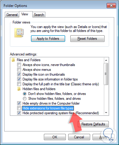 En la ventana desplegada vamos a la pestaña View y desactivamos la casilla Hide extensions for known file types