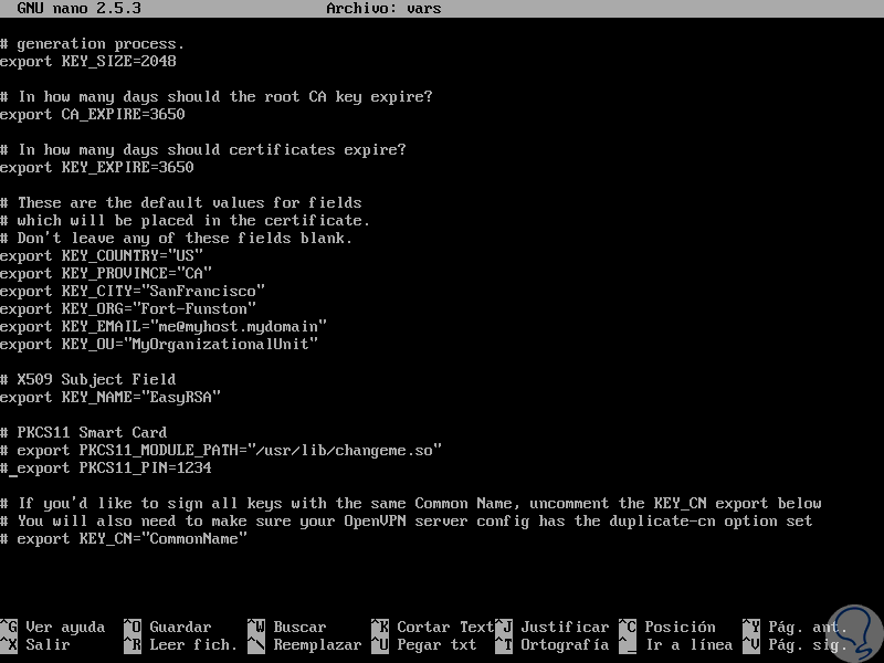 Editamos estos valores en base a los parámetros que sean requeridos. Del mismo modo editaremos la línea export KEY_NAME asignado el nombre adecuado, en este caso la hemos llamado server.