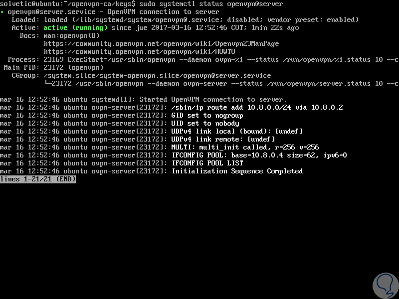 Con estos valores ya definidos estamos en condición de arrancar el servicio de OpenVPN en Ubuntu y para ello será necesario especificar el nombre que hemos asignado.
