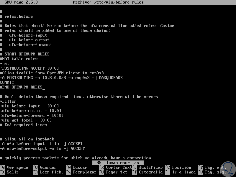 En este ejemplo la interfaz de red pública es enp0s3. Ahora accederemos al archivo de configuración de reglas para su ajuste, ingresamos lo siguiente: