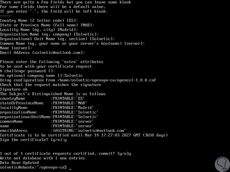 ./build-key-server serverDebemos reemplazar el nombre servidor por el asignado en la línea export KEY_NAME del archivo vars). De forma automática se emitirán los valores ya definidos en el archivo vars por lo cual pulsamos Enter.
