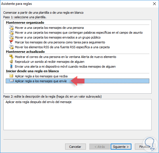 Pulsamos en la opción Nueva regla y en la ventana desplegada vamos a la línea Aplicar regla a los mensajes que envíe ubicada en el campo Iniciar desde una regla en blanco: