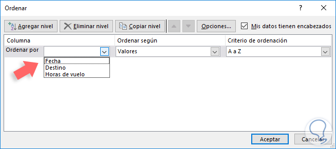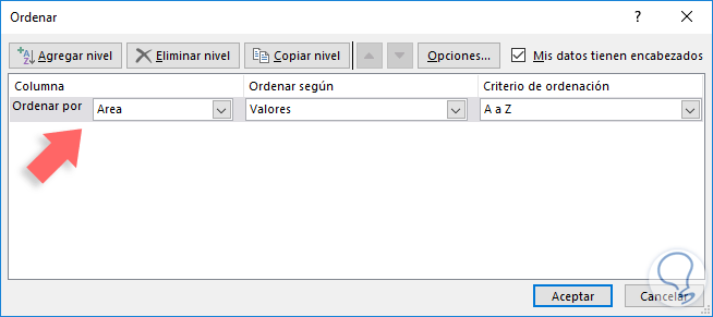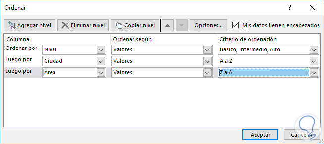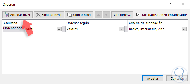 Allí seleccionamos la opción Agregar nivel y definiremos que parámetros usar para el ordenamiento. Es posible agregar los niveles deseados: