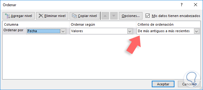 Vamos al campo Criterio de ordenación y definimos el nivel de orden a usar, en este caso hemos dejado De más antiguos a más recientes para que despliegue primer las fechas más antiguas en el rango: