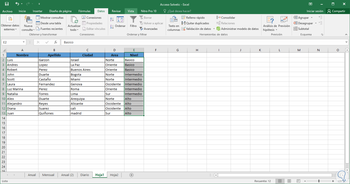 Excel 2016 nos ofrece la posibilidad de crear criterios de orden personalizables. Hemos añadido la siguiente columna (Nivel):