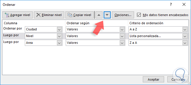 Es posible que deseemos modificar el nivel de ordenamiento, para ello vamos de nuevo a la opción Ordenar y pulsamos sobre los botones de subir o bajar nivel: