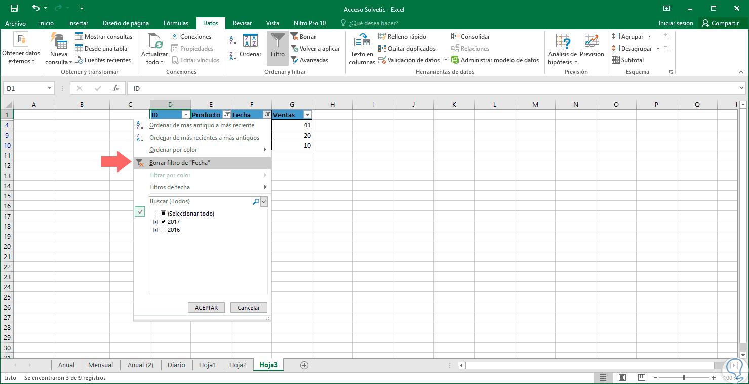 Si deseamos borrar alguno de los filtros aplicados debemos desplegar las opciones de filtro y seleccionar la opción Borrar filtro de.