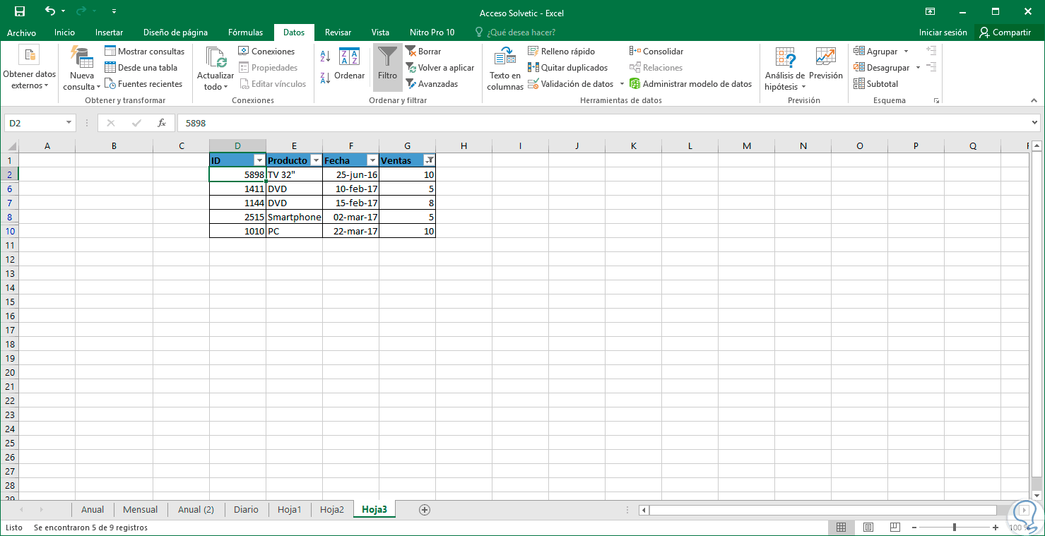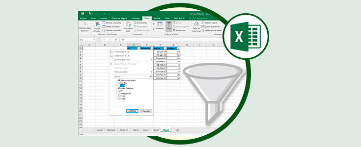 Podemos ver el resultado deseado y notemos que las columnas Producto y Fecha tiene filtros activos: