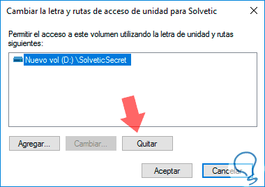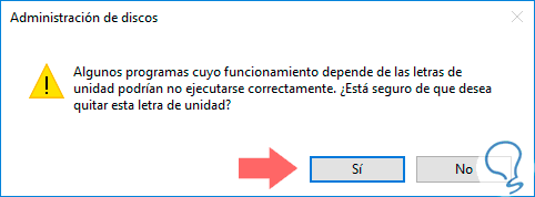 Allí seleccionamos la letra asignada actualmente a la unidad y pulsamos en el botón Quitar. Se desplegará el siguiente mensaje el cual aceptaremos: