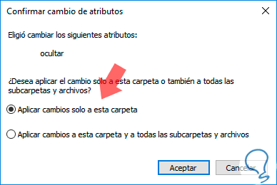 Pulsamos en Aplicar y en el mensaje desplegado activamos la opción Aplicar cambios solo a esta carpeta. Pulsamos Aceptar. De este modo dicha unidad ya no será visible en el explorador de archivos y podremos acceder a ella usando el símbolo del sistema.