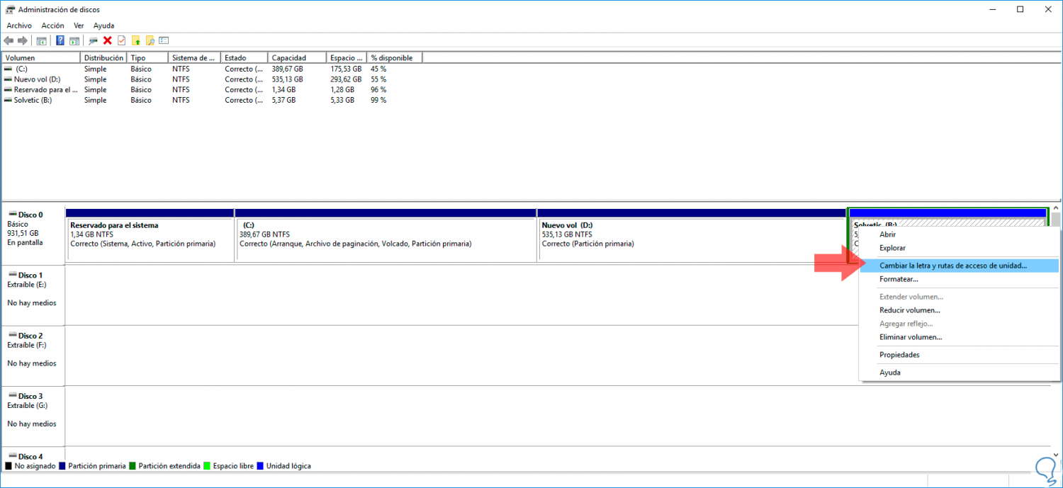 Ahora daremos de nuevo clic derecho sobre la unidad y seleccionamos Cambiar la letra y rutas de acceso de unidad y veremos lo siguiente: