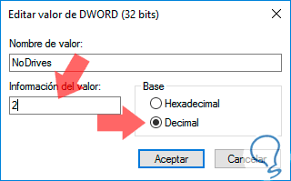 En la ventana desplegada asignaremos el respectivo nombre. Damos doble clic sobre este nuevo valor, o clic derecho / Modificar, seleccionamos la casilla Decimal y establecemos el valor 2: