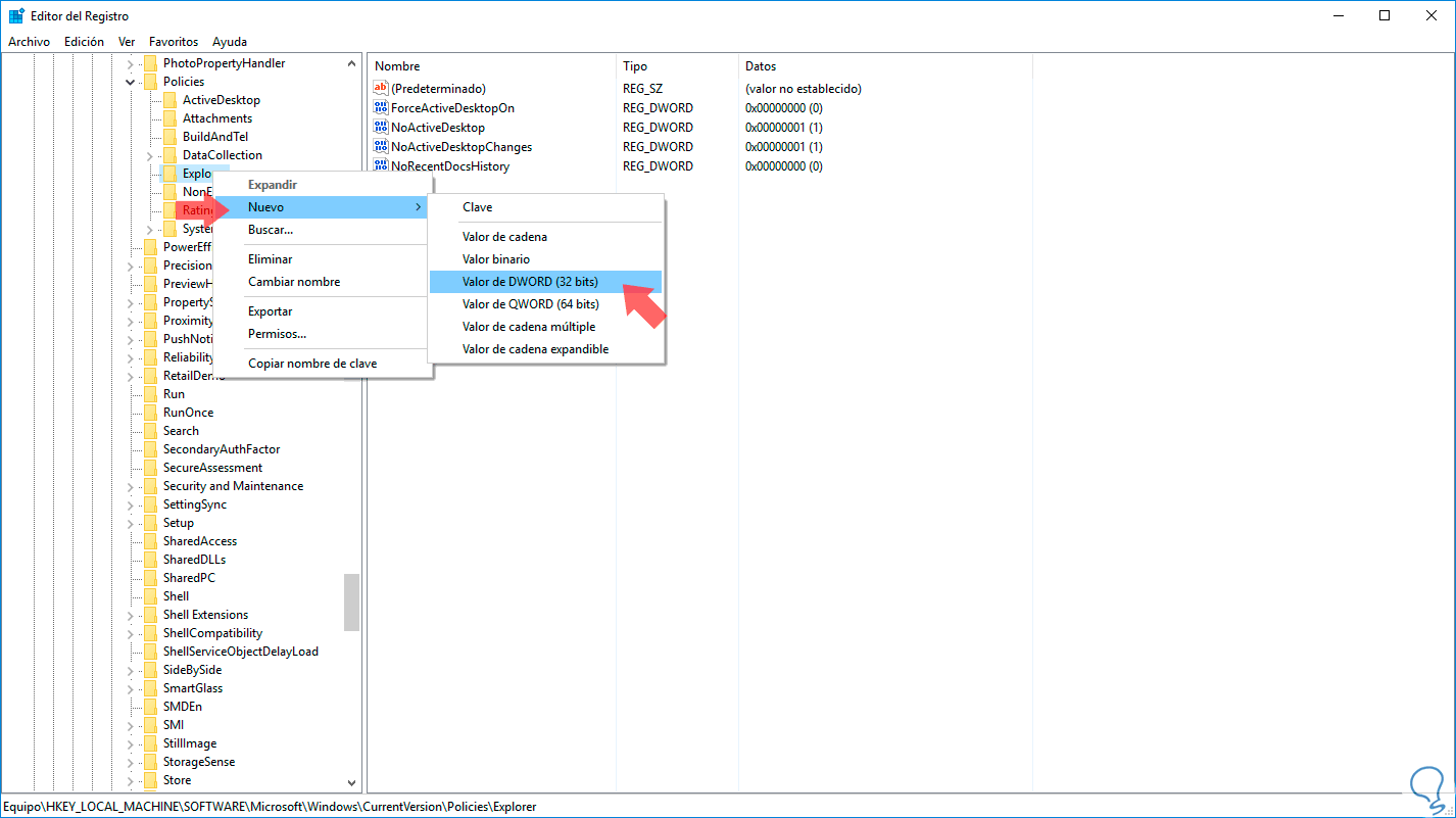 Ahora debemos crear un nuevo valor DWORD llamado NoDrives, y para ello damos clic derecho sobre Policies y seleccionamos la opción Nuevo / Valor de DWORD (32 bits)