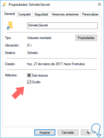 A continuación abrimos el explorador de archivos de Windows 10, vamos a la ruta donde hemos creado la carpeta, damos clic derecho sobre ella y seleccionamos la opción Propiedades y en la ventana desplegada activamos la casilla Oculto: