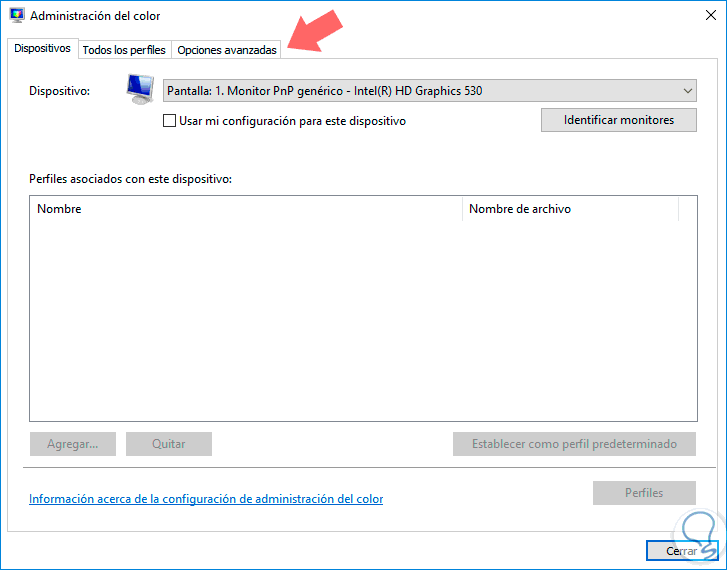 Podemos ver que tenemos la opción Administración del color la cual nos permite definir los respectivos valores de color del monitor. Pulsamos en esta opción y veremos la siguiente ventana donde seleccionaremos el monitor en el campo Dispositivo: