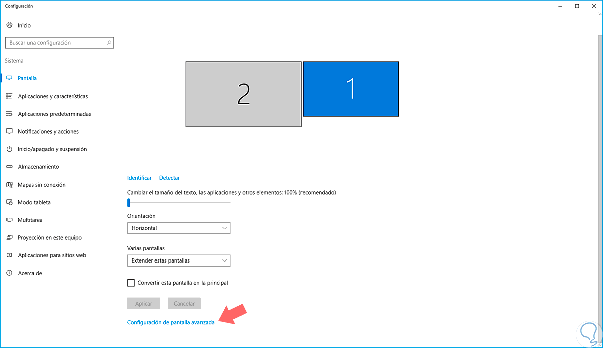 Allí seleccionamos la opción Configuración de pantalla avanzada y se desplegará la siguiente ventana donde nos desplegaremos a la parte inferior: