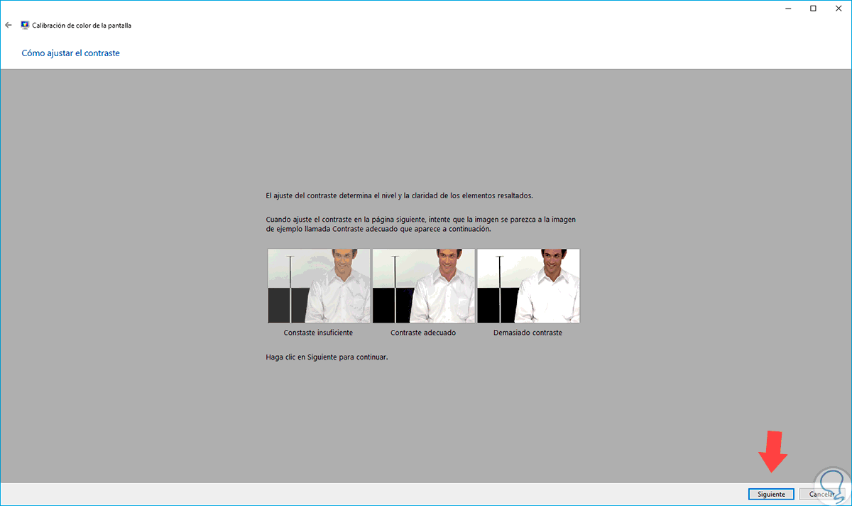 Al pulsar Siguiente será necesario realizar los ajustes del contraste el cual se encarga de definir la claridad y el nivel de los elementos desplegados:
