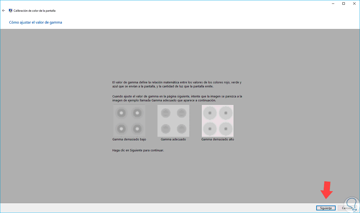 Allí deslizaremos la barra deslizante hasta los niveles deseados. Una vez definidos los valores de Gamma pulsamos en Siguiente y veremos la siguiente ventana: