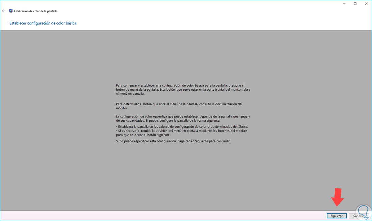 En la primer opción se configurarán los parámetros del color, para ello, según indica la propia herramienta, podemos pulsar sobre el botón de menú del monitor o bien pulsar en Siguiente en caso de no lograrlo: