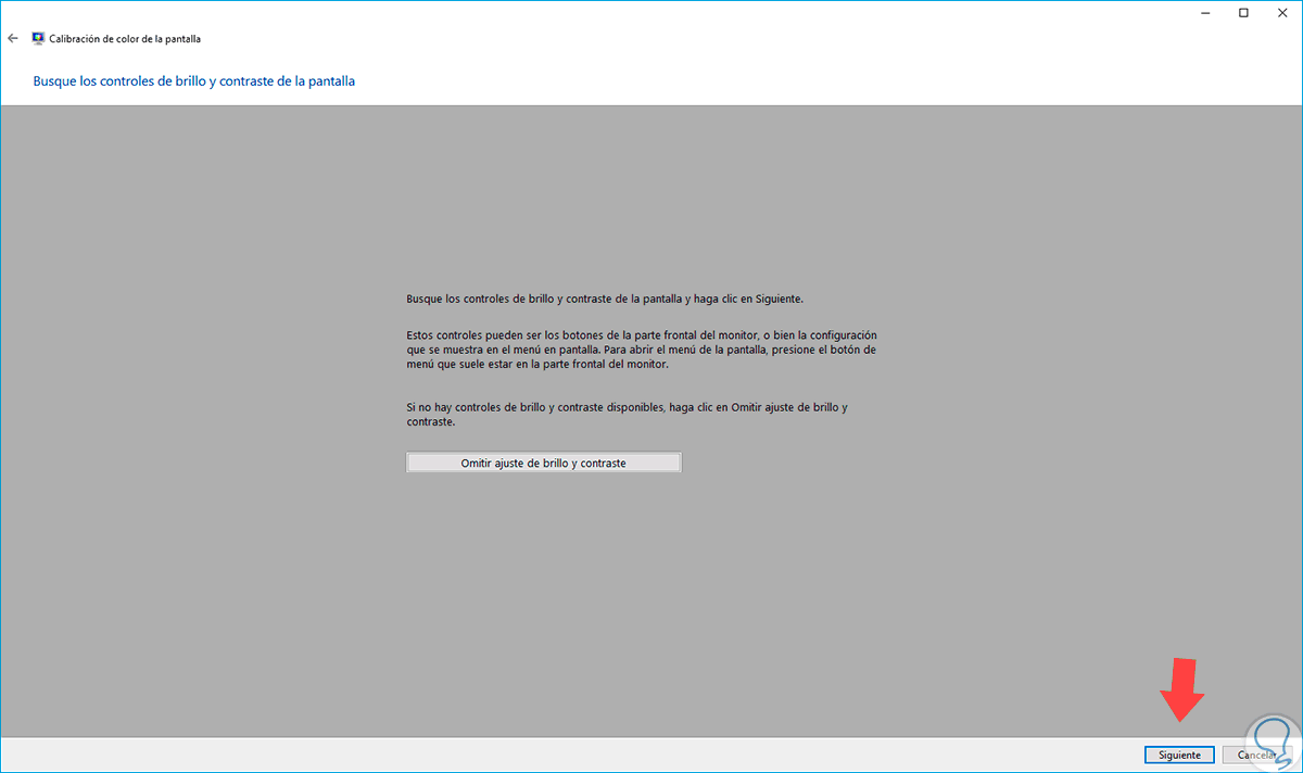 Allí podemos ajustar los valores de brillo y contraste pulsando directamente en los botones del monitor o bien pulsar sobre Siguiente para que sea la herramienta la que nos brinde la opción de editar dichos parámetros: