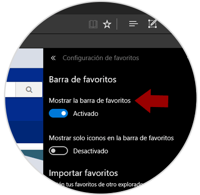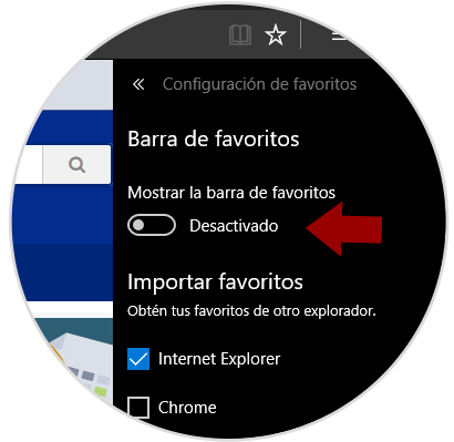 Allí pulsamos sobre el interruptor Mostrar la barra de favoritos para que su estado pase a ser Activado. Desde esta misma opción podremos importar los favoritos de otros navegadores que tengamos instalados en Windows 10. Si deseamos ocultar la barra de favoritos basta con pulsar el icono para que su estado pase a ser Desactivado