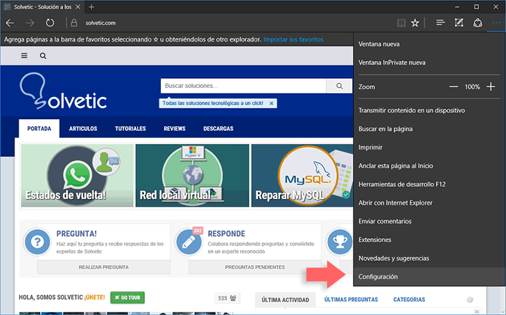 Una de las maneras de poder acceder más fácilmente a los sitios web más visitados es agregando dichos sitios web a los favoritos y desde allí acceder con un solo clic. En el nuevo navegador de Windows 10, Microsoft Edge, por defecto la barra de favoritos se encuentra oculta y a continuación vamos a analizar cómo podemos visualizarla, o bien, ocultarla en este navegador. Para ello vamos a utilizar el menú Configuración de Microsoft Edge.