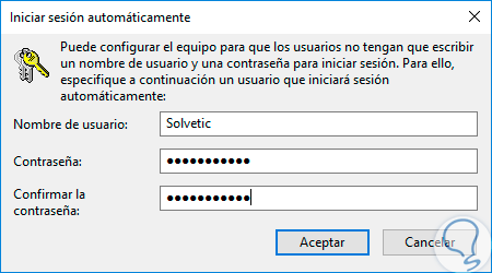 Pulsamos en Aplicar y se desplegará la siguiente ventana donde confirmaremos la contraseña actual para ejecutar el cambio. Pulsamos en Aceptar y de este modo iniciaremos sesión de forma automática en Windows 10.