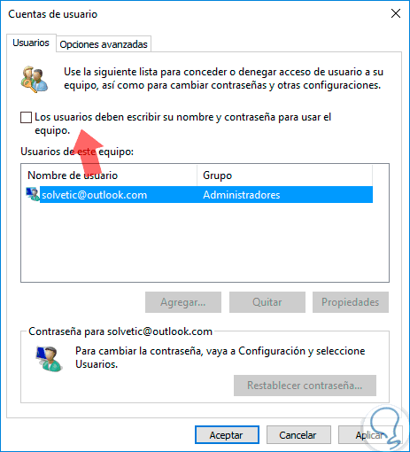 Allí debemos seleccionar el respectivo usuario y desactivar la casilla Los usuarios deben escribir su nombre y contraseña para usar el equipo: