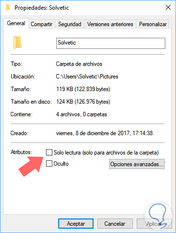 Para corregir esto, daremos de nuevo clic derecho en la carpeta con error y en la pestaña General desactivamos la casilla Solo lectura: