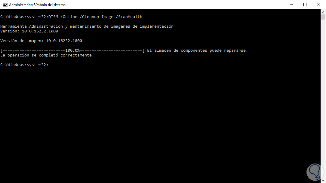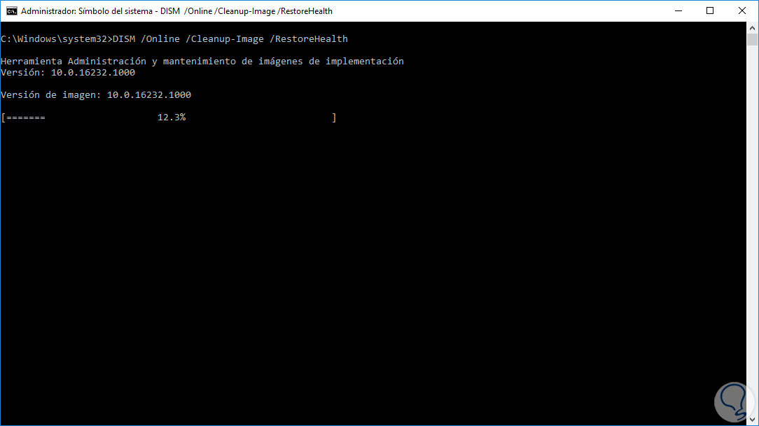 DISM (Deployment Image Servicing and Management) es una utilidad de imágenes de Windows mediante la cual se hace un análisis detallado de la imagen actual del sistema en búsqueda de errores o fallas que afecten el optimo comportamiento del sistema o sus archivos. Para su ejecución, accederemos como administradores al símbolo del sistema y ejecutaremos la siguiente línea: