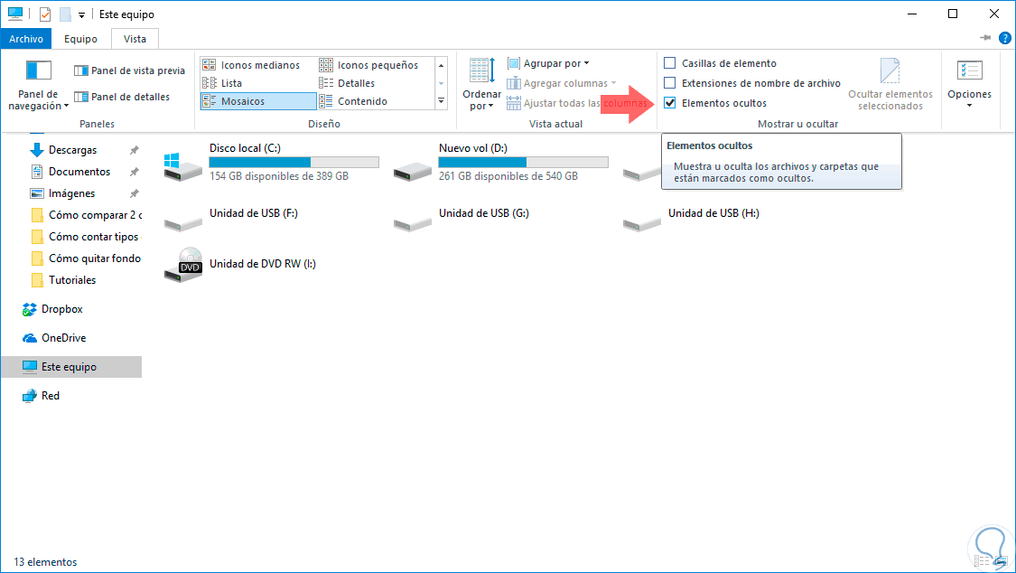 Abrimos el Explorador de Windows ir a la pestaña Vista y allí activar la casilla Elementos ocultos: