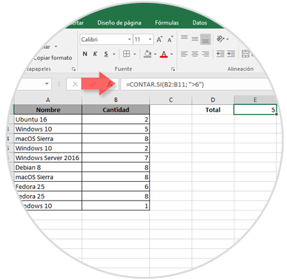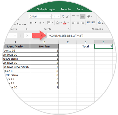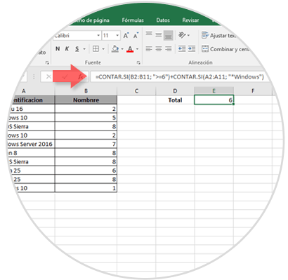 =CONTAR.SI(B2:B11; ">=6")+CONTAR.SI(A2:A11; "*Windows")