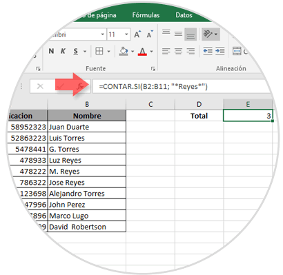 Esto es útil cuando tenemos una serie de datos y deseamos conocer exactamente cuántas celdas contiene una palabra especial, por ejemplo, tenemos una serie de nombres y apellidos y deseamos saber cuántos usuarios tienen el apellido Reyes. Para esto ejecutamos la siguiente sintaxis: