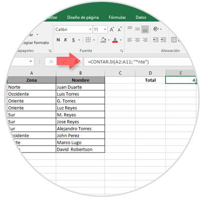 Es posible que en determinados momentos deseemos contar las celdas que inicien o terminen en caracteres específicos, para ello podemos usar el símbolo* o el símbolo ?. En este ejemplo contaremos las celdas que terminan en nte.