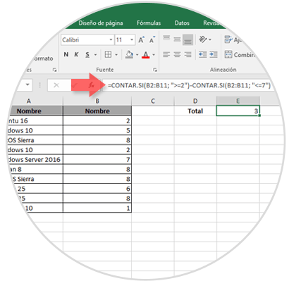 =CONTAR.SI(B2:B11; ">=2")-CONTAR.SI(B2:B11; "<=7")
