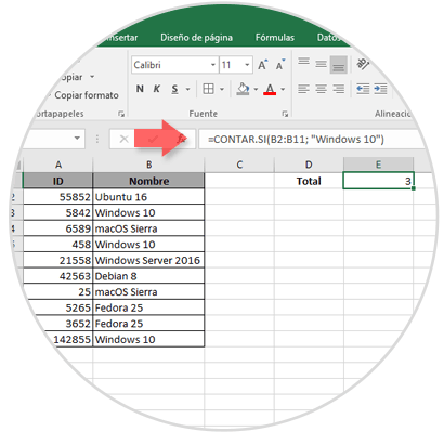 Es el uso básico que le damos a esta función y consiste en seleccionar un determinado rango e indicar el parámetro a buscar en este. Por ejemplo usaremos la siguiente línea para contar las celdas que contienen la palabra Windows 10. Podemos ver que tres (3) celdas cumplen con la condición indicada.
