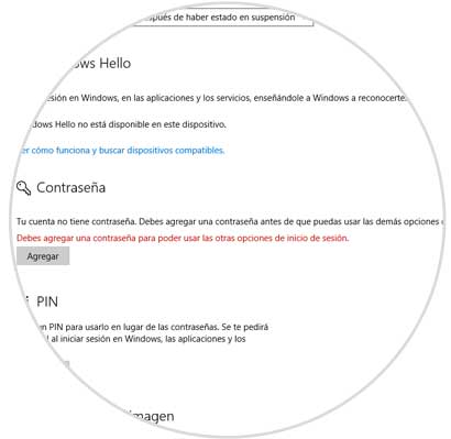 El mensaje “Debe agregar una contraseña para poder usar las otras opciones de inicio de sesión” indican que la cuenta actual está sin contraseña como lo hemos configurado. De esta forma podemos eliminar o modificar la contraseña en Windows 10.