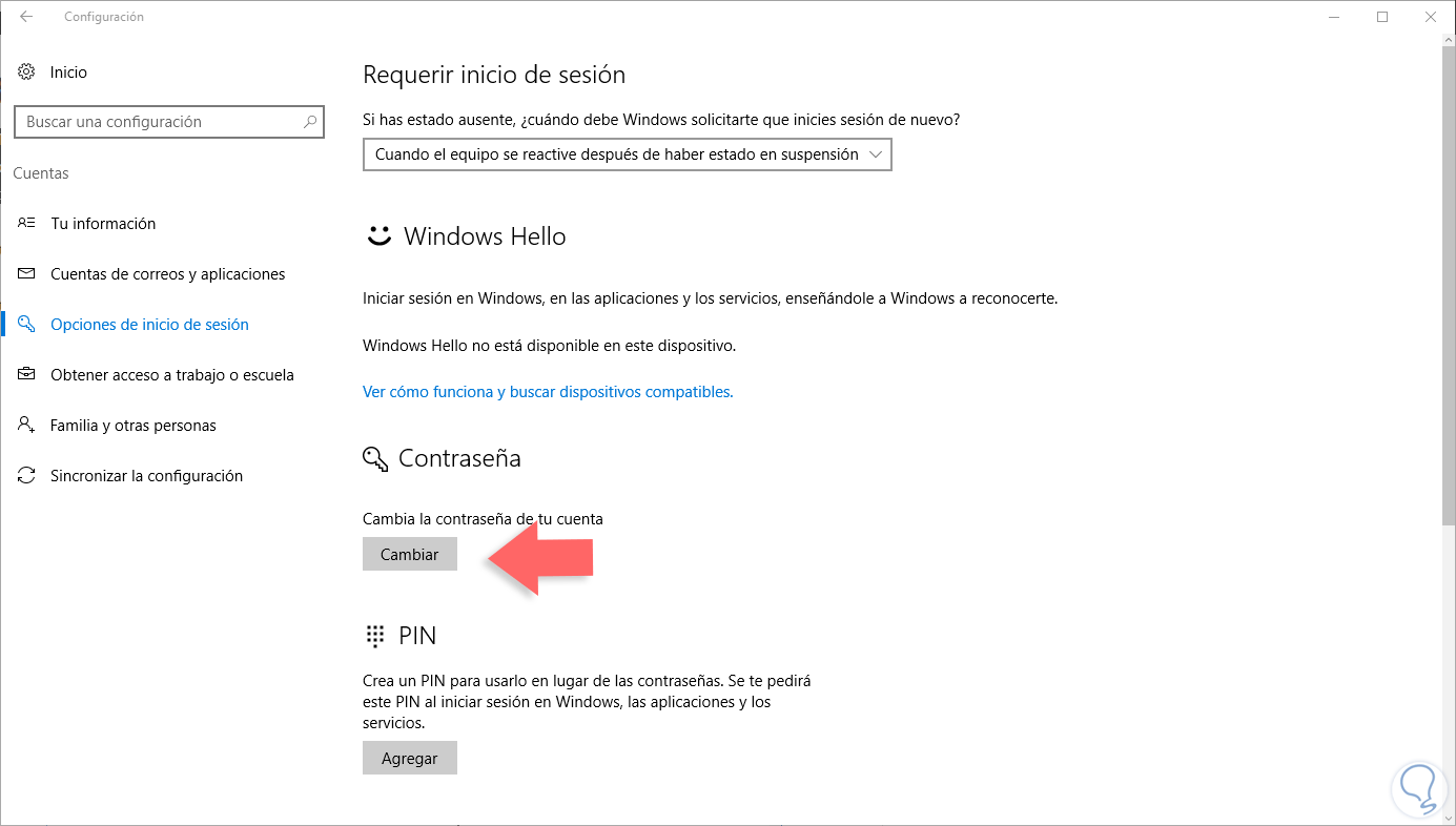 Seleccionamos la opción "Cuentas" y vamos a la línea "Opciones de inicio de sesión". Se desplegará la siguiente ventana: