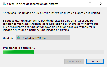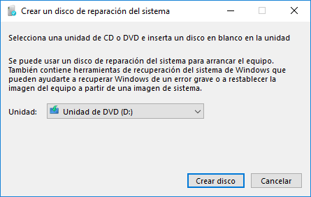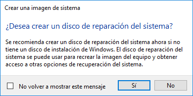 Una vez finalice el proceso de respaldo de la imagen veremos la siguiente ventana donde tendremos la posibilidad de crear un disco de reparación del sistema el cual es efectivo en caso de solucionar problemas asociados al arranque de Windows 10:
