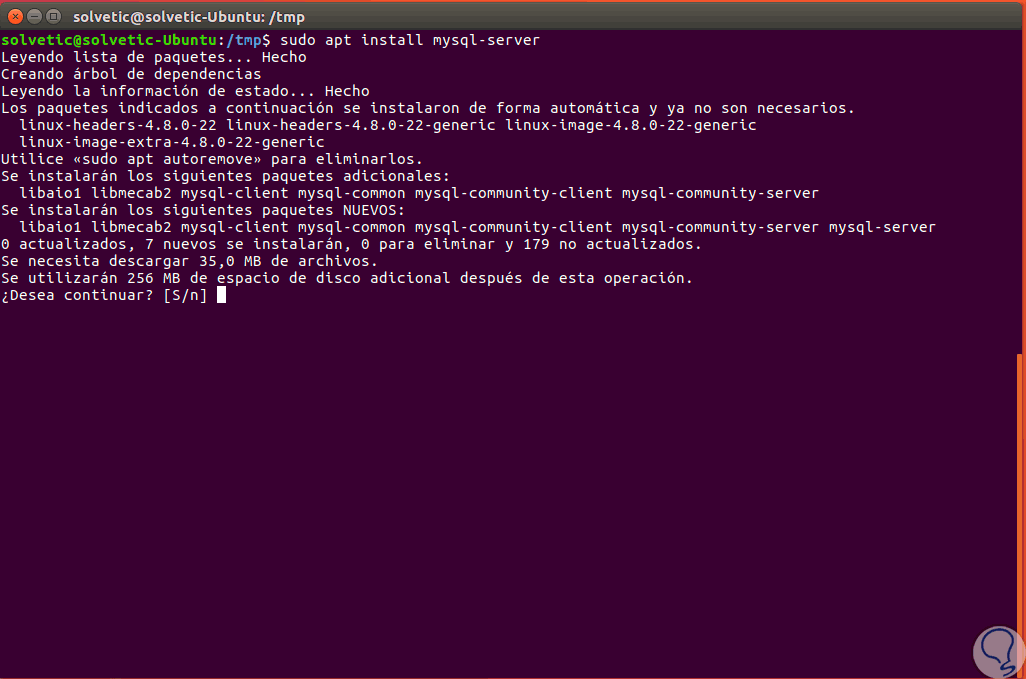 Una vez configurados estos parámetros procedemos a instalar MySQL de manera oficial, para ello ejecutaremos el siguiente comando. Ingresamos la letra S para aceptar la descarga y respectiva instalación de MySQL en Ubuntu 16.10.