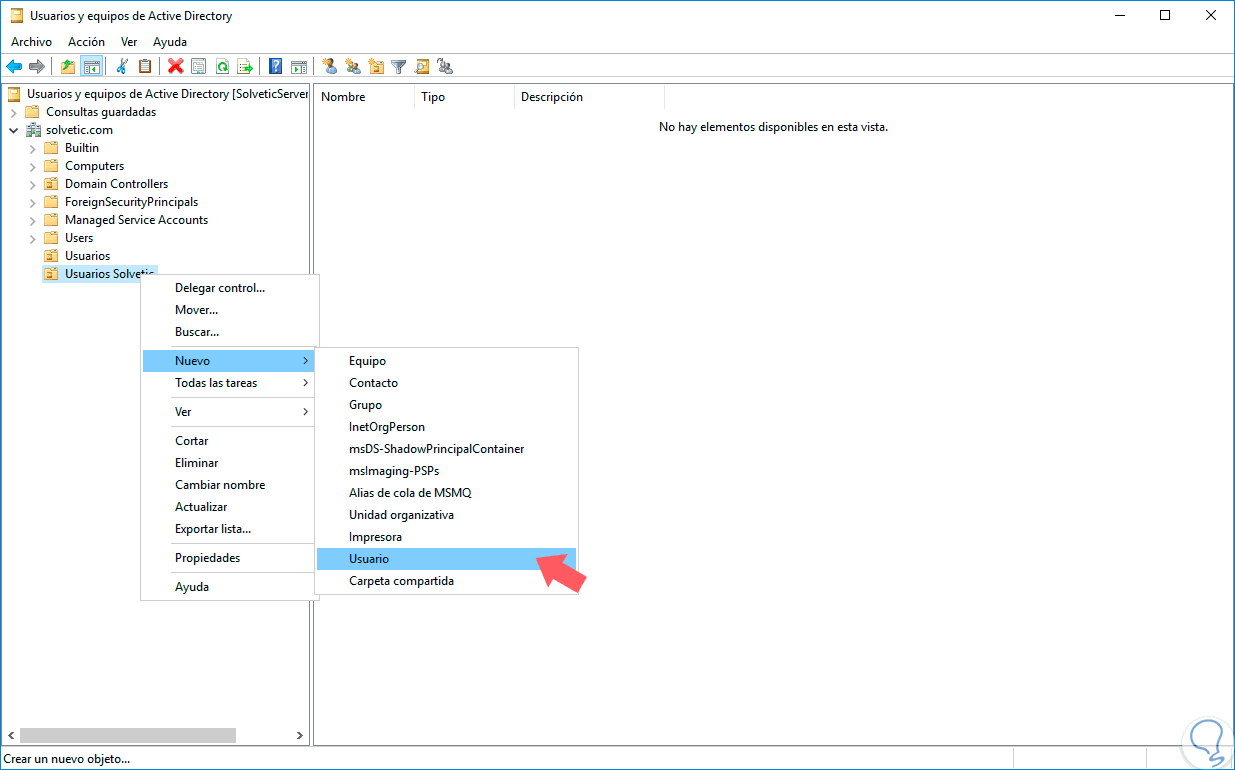 Una vez creada la OU procedemos a crear el usuario dentro de dicha Unidad Organizativa dando clic derecho sobre la OU y seleccionando la opción Nuevo / Usuario